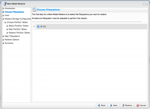Go to the Backup Manager panel. Navigate to Recovery Points, and in the Actions menu for the recovery point you want to restore, choose Bare Metal Restore.