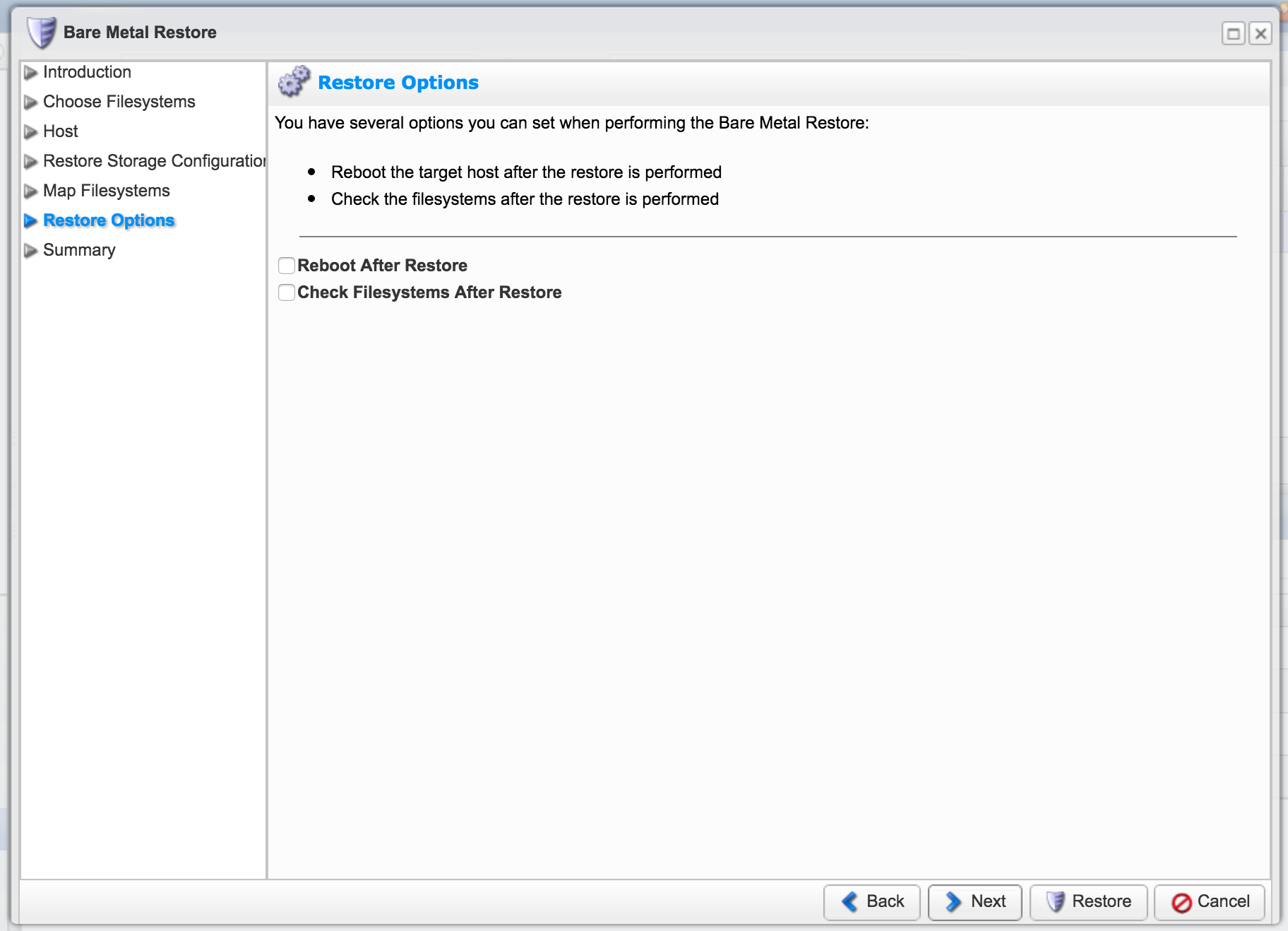 Use the default settings, assuming you want to restore the backup onto the original server. After proceeding through the settings, click Restore.